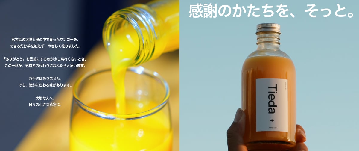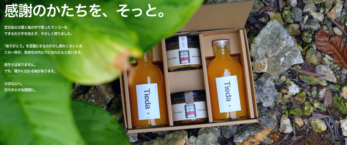 オリジナルブランドのTieda+から約2年の開発期間を経て、マンゴー農家が本気で考えた宮古島産マンゴージュース。 企画・開発から製造すべてにおいて丁寧に向き合い、「農家だからこそ作れる、本当に美味しいマンゴージュースを届けたい」という想いをこのプロダクトに込めました。 国内王道の「アップルマンゴー」を贅沢に使用し、極上のマンゴージュース に仕上がっています。 ー無添加、無着色へのこだわりと島の恵みを活かすことー 余計なものは一切加えず、素材の味を最大限に引き出すこと。 マンゴーは100%ジュースにすると固形状になるため実現が難しく、 飲みやすさ、美味しさを実現できた果汁50%で使用。 また、添加物、着色料ゼロ。 更に、沖縄県産のキビ糖、キビ酢も使用しました。 マンゴー本来の味を損なうことなく、県産素材に拘りと誇りを持ち、自然で深みのある美味しさをお届けします。 ー商品情報ー 内容量:300ml 原材料:アップルマンゴー(宮古島産)、きび糖(沖縄県産)、きび酢(沖縄県産)、レモン果汁 賞味期限:製造から3ヶ月 開封後は冷蔵保存でお早めにお召し上がりください。 ー注意事項ー 果汁量が多いこと、添加物が入っていないことから、ジュースが分離する可能性がございます。 開封の際はゆっくりと瓶を振ってからお召し上がり下さい。